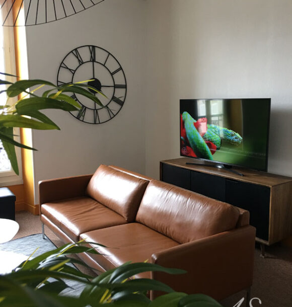Nous avons pris le parti d’accentuer la décoration dans un style masculin avec des touches de noir et des matières brutes comme le cuir ou encore le métal. Quelques plantes sont venues composer le décor afin d’apporter un peu de douceur à cet espace.