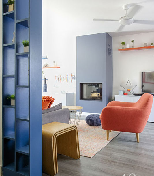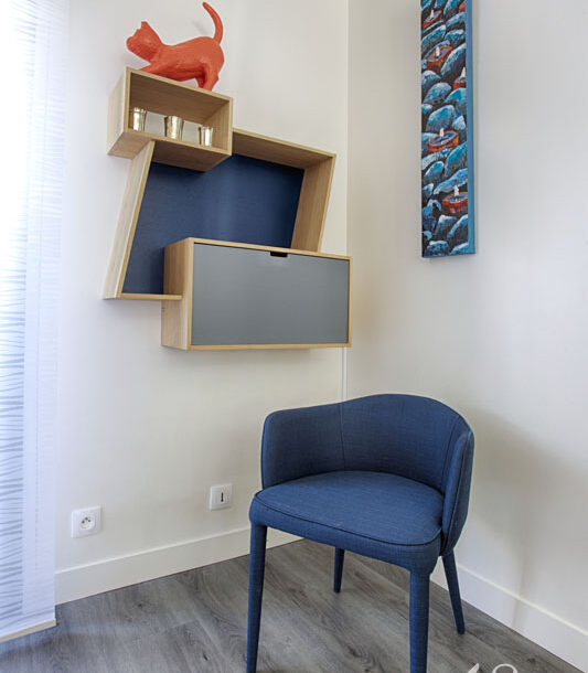 Enfin, pour délimiter l’entrée du séjour, nous avons dessiné un claustra bleu “dynamique” pour correspondre aux teintes utilisées sur les tableaux de Caroline.