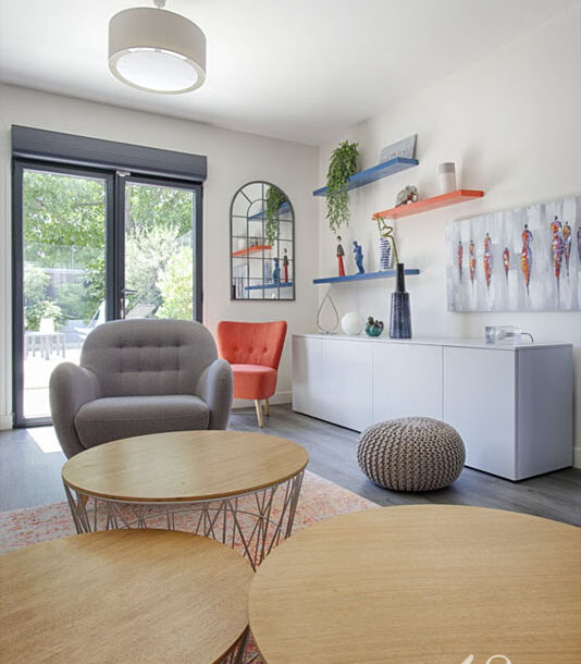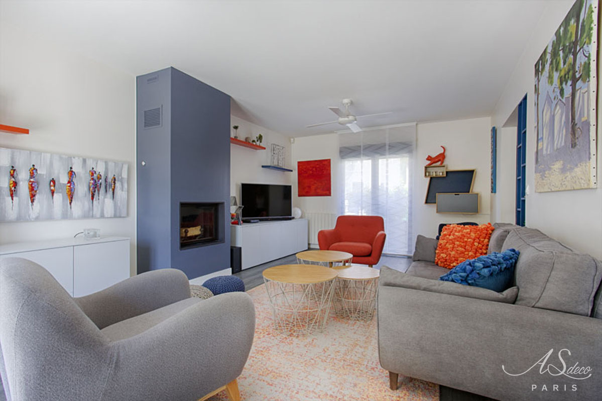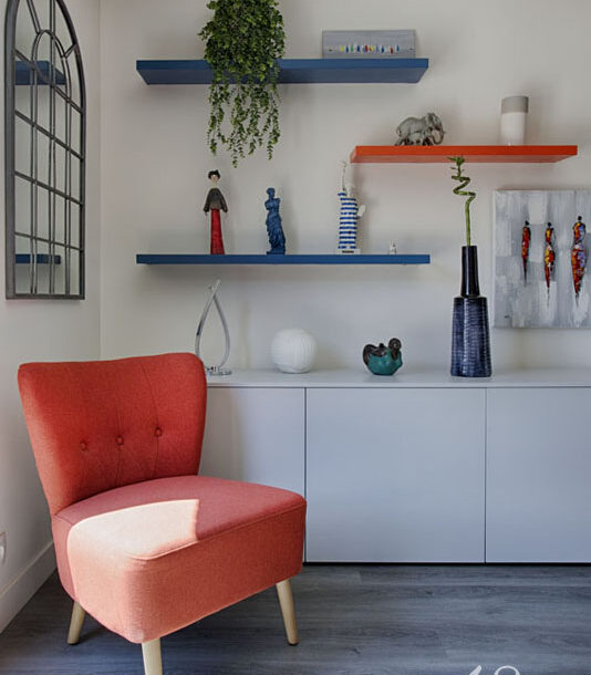 D’un salon “classique”, nous sommes arrivés à créer un espace fonctionnel et plein de gaieté grâce au choix des couleurs des murs, des meubles et des accessoires décoratifs.