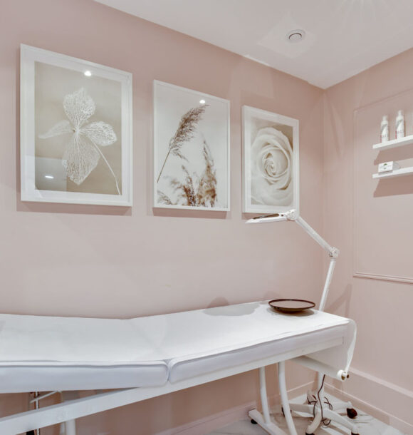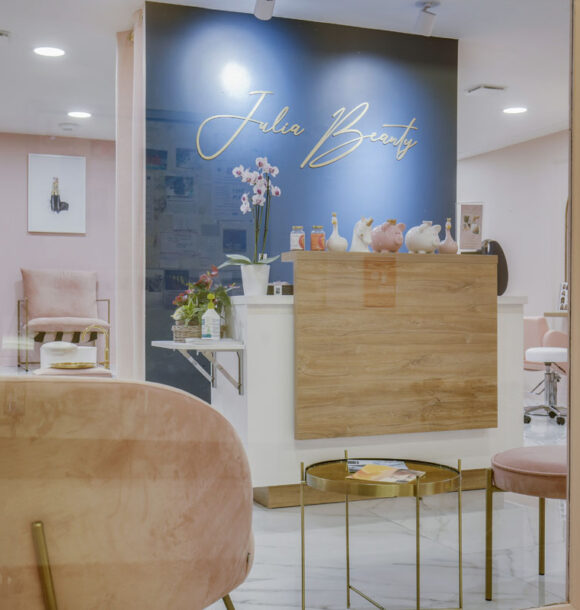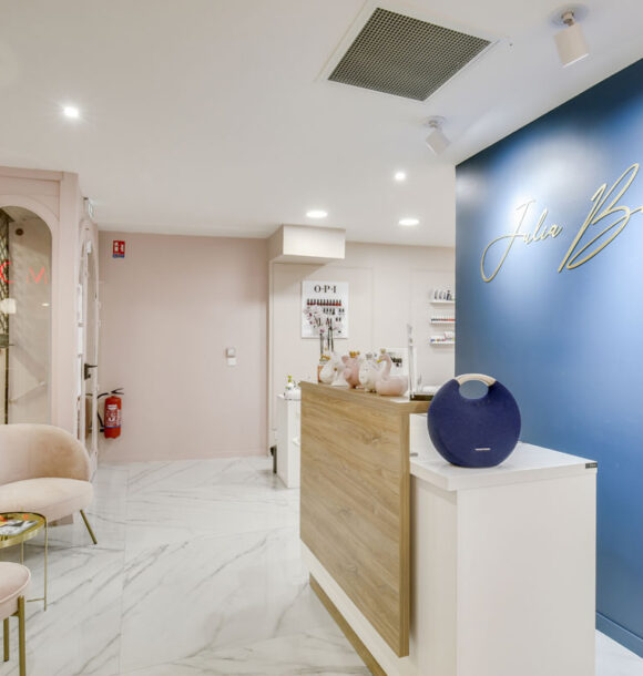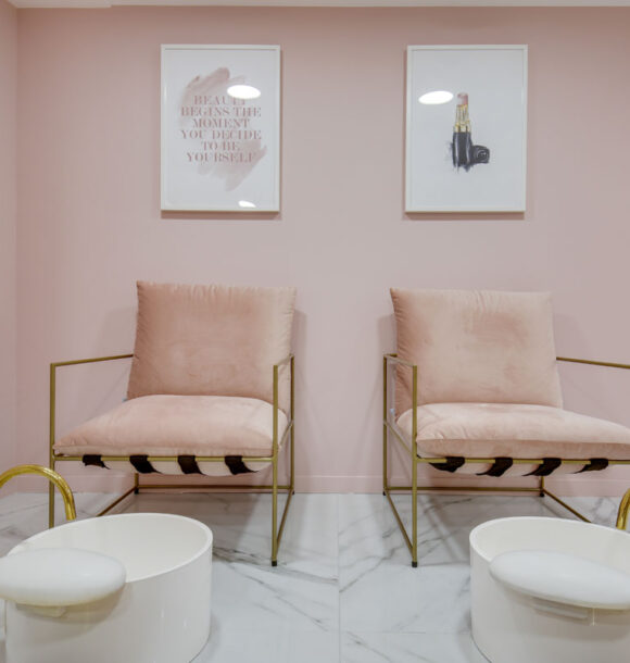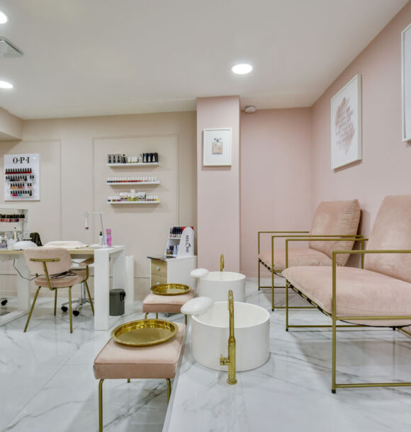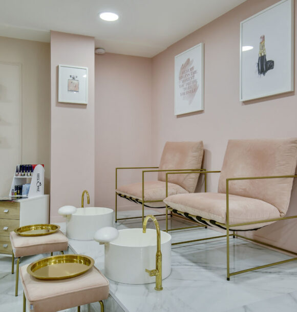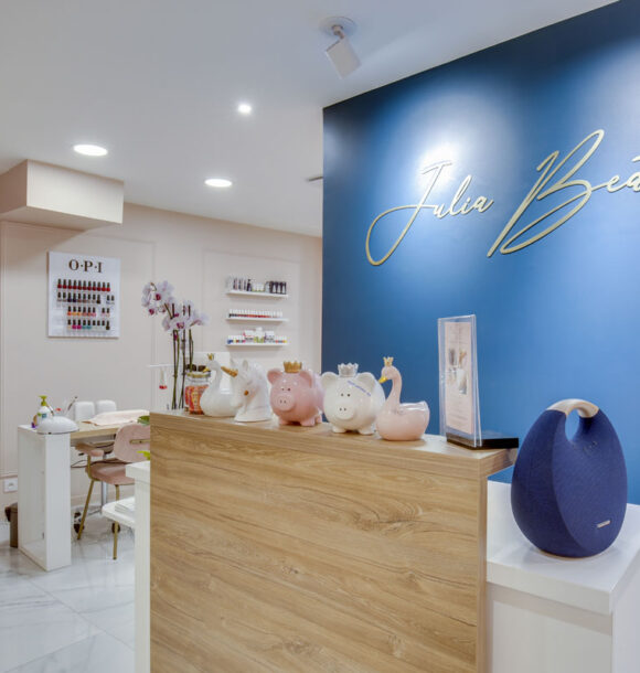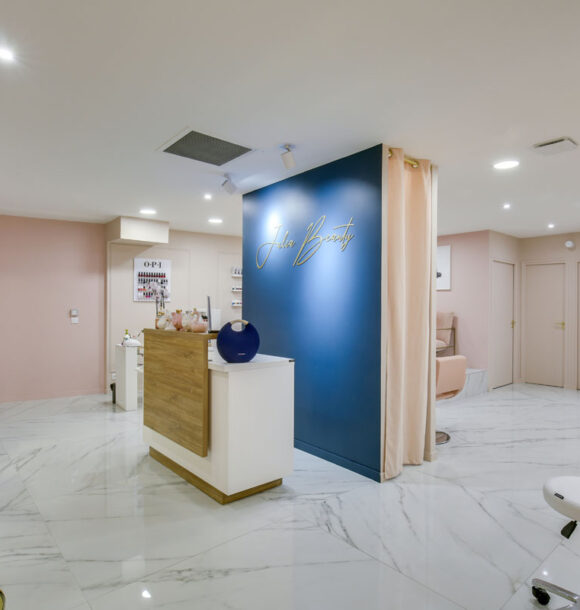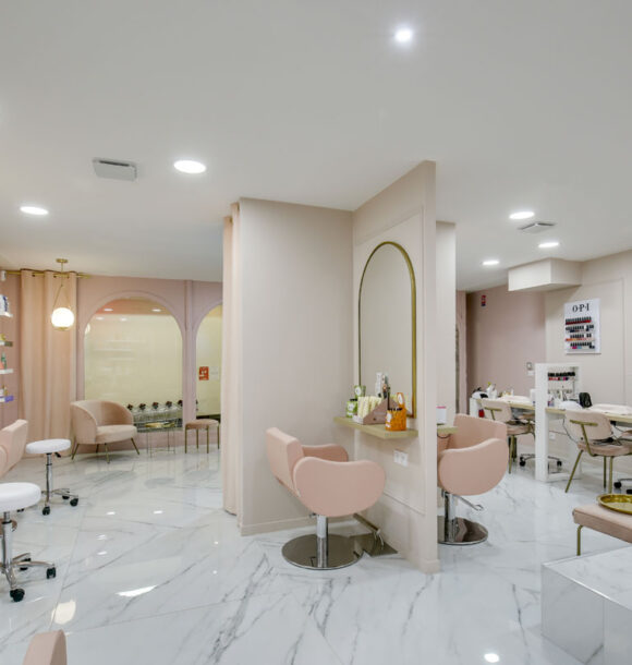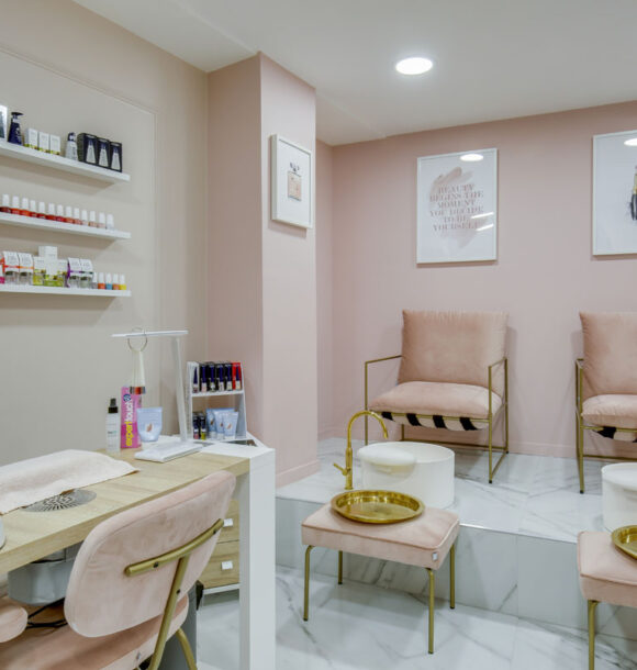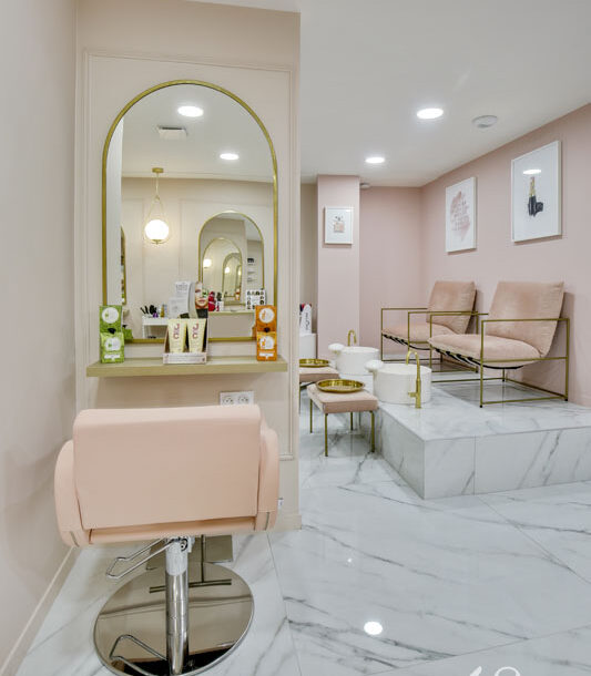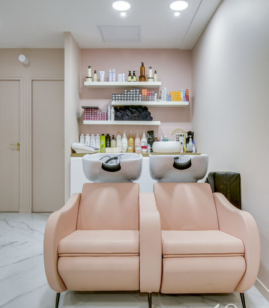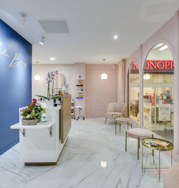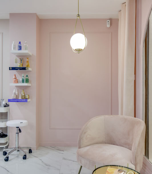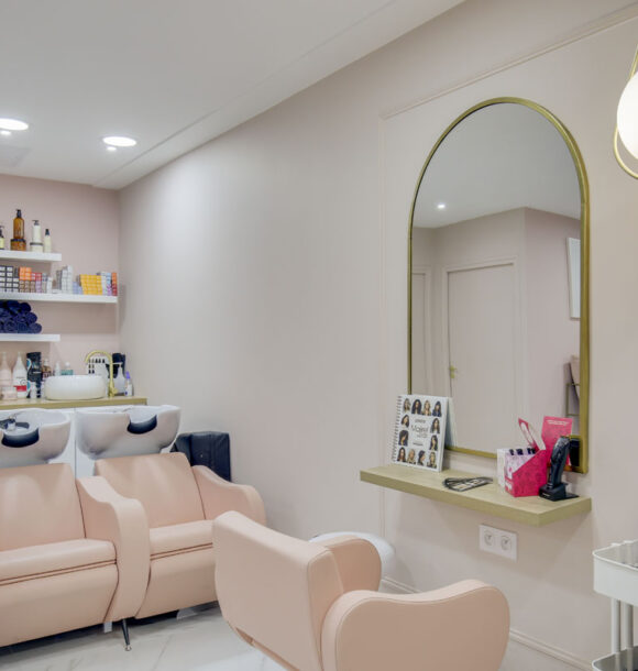 Nous avons opté pour des murs roses et beiges poudrés pour donner plus de clarté au local. Côté assises, nous avons choisi des revêtements couleur rose pastel s’associant parfaitement à la finition laiton du petit mobilier, miroirs et luminaires. Au niveau de la banque d’accueil, nous avons proposé un bleu profond au mur qui permettait de mettre en valeur le logo doré du salon. Nous avons même accompagné nos clients sur le choix de la typographie du logo et sa finition. Côté sol, nous avons sélectionné un carrelage effet marbre blanc afin d’apporter plus de luminosité dans ce local qui ne bénéficiait d’aucune lumière naturelle.