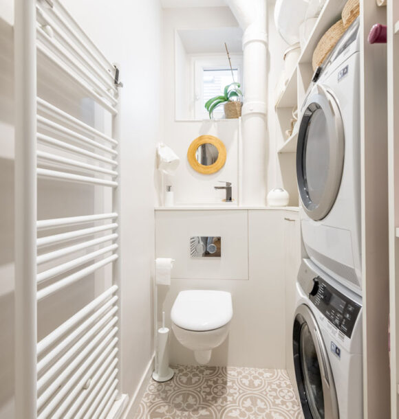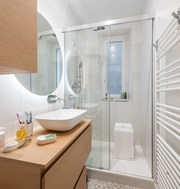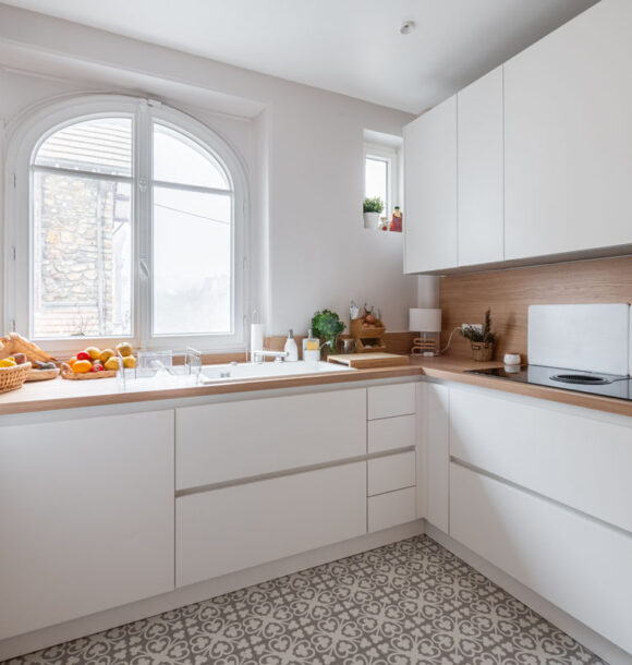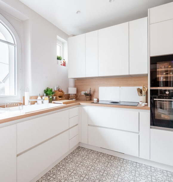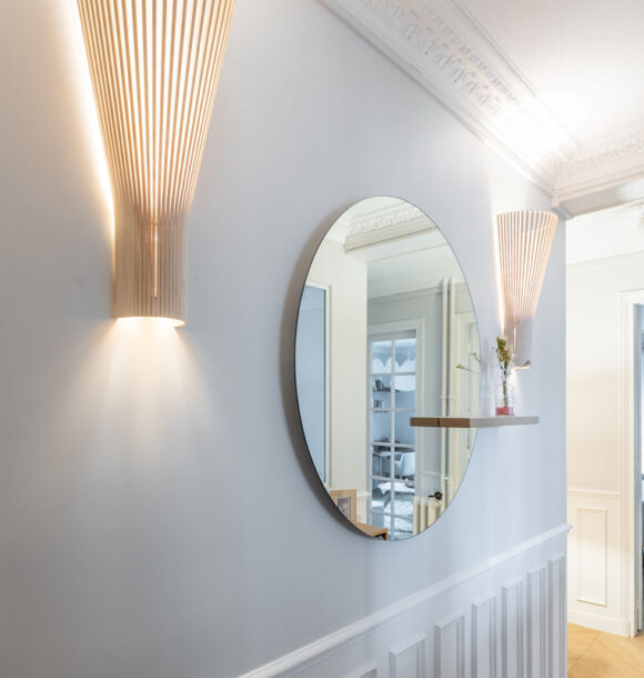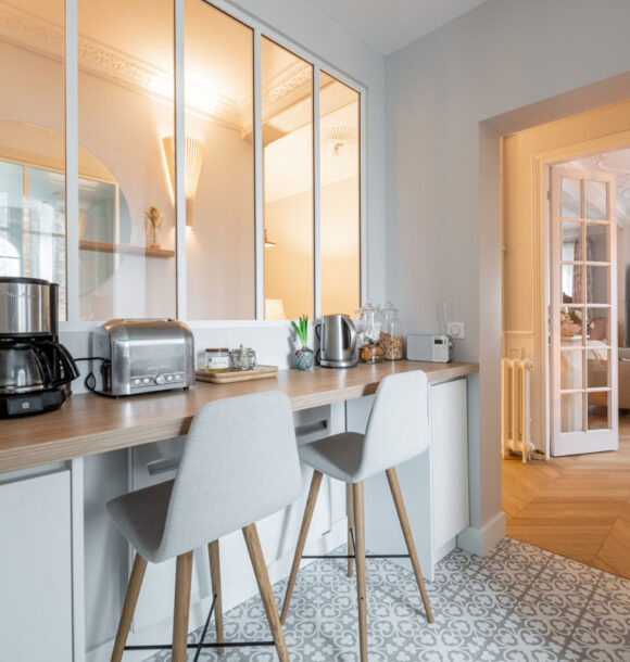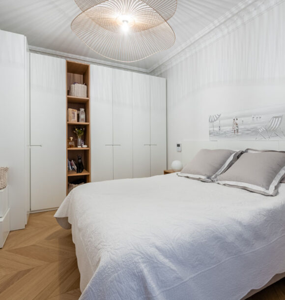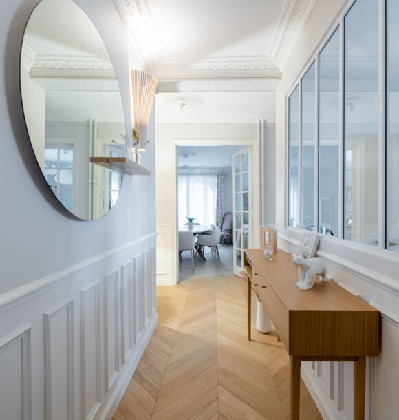Lorsque nos clients, jeunes retraités, nous ont contactés : ils souhaitaient redonner tout son potentiel à leur appartement tout juste acheté. L’appartement bénéficiait de nombreux atouts de part la disposition des pièces principales (séjour et chambres) et des moulures au plafond déjà existantes. Seule la cuisine, l’entrée et les pièces d’eau avaient besoin d’être optimisées au mieux afin de faire entrer la lumière dans cet appartement déjà plein de cachet.