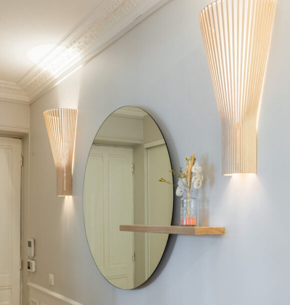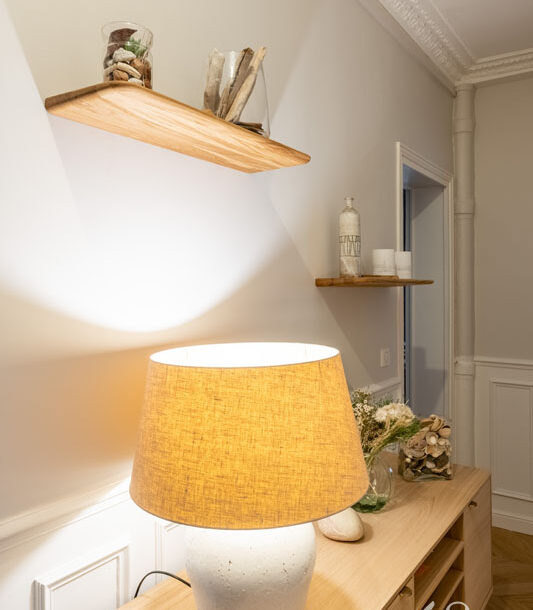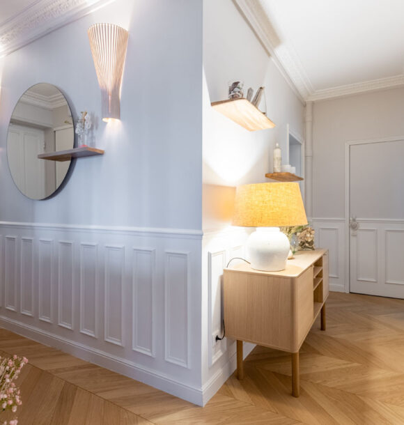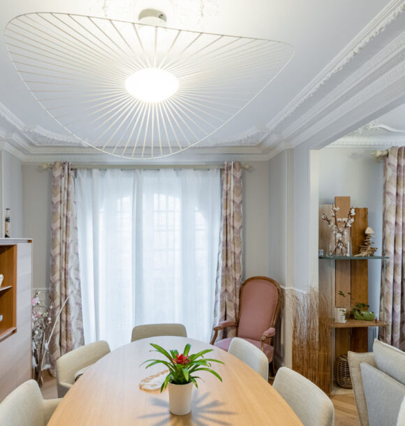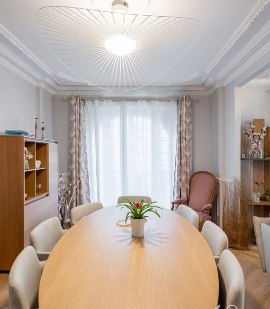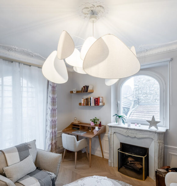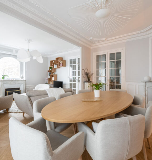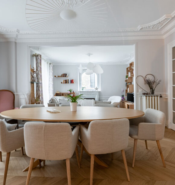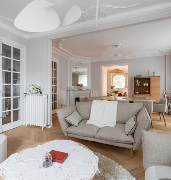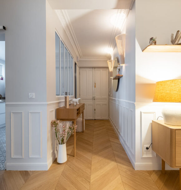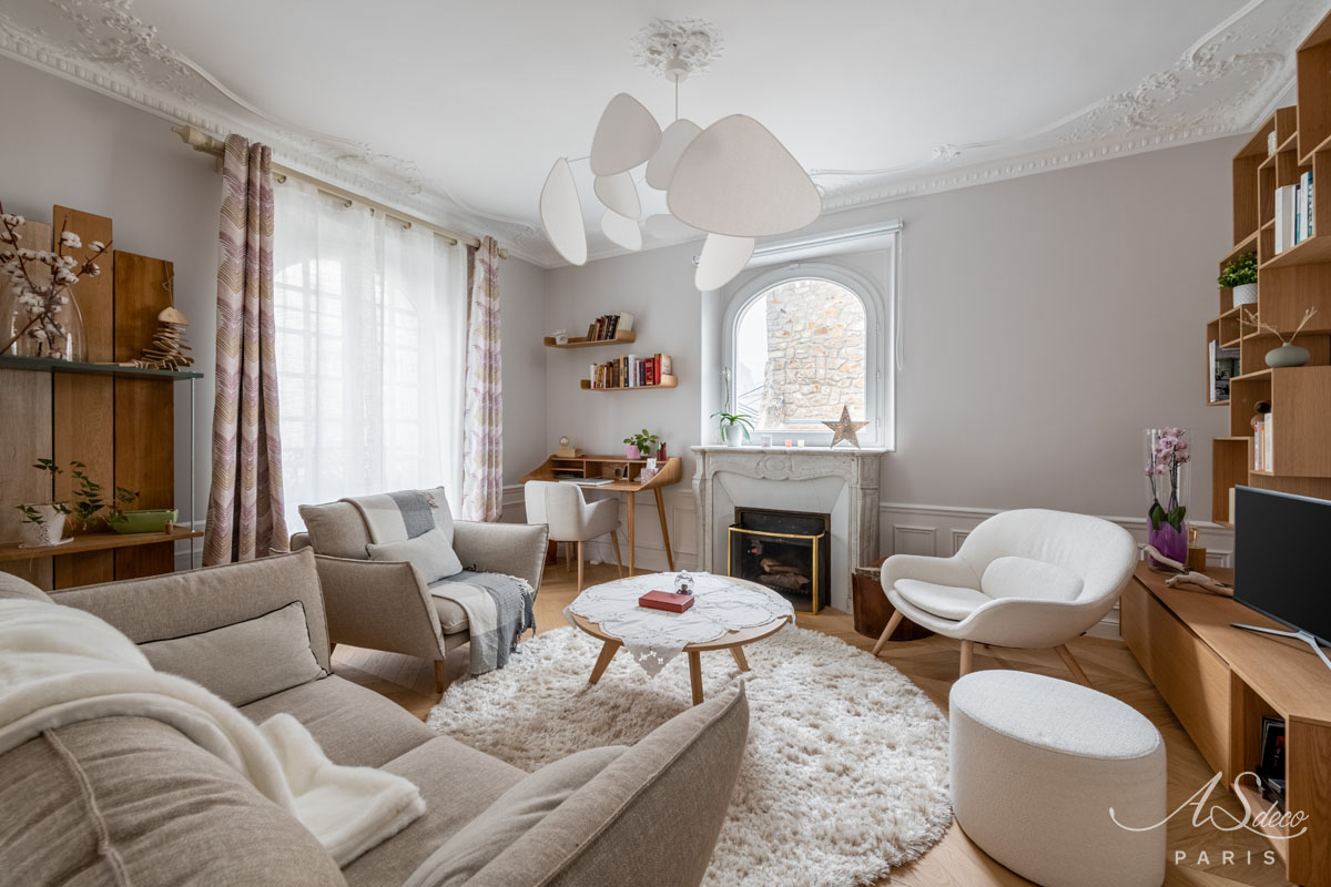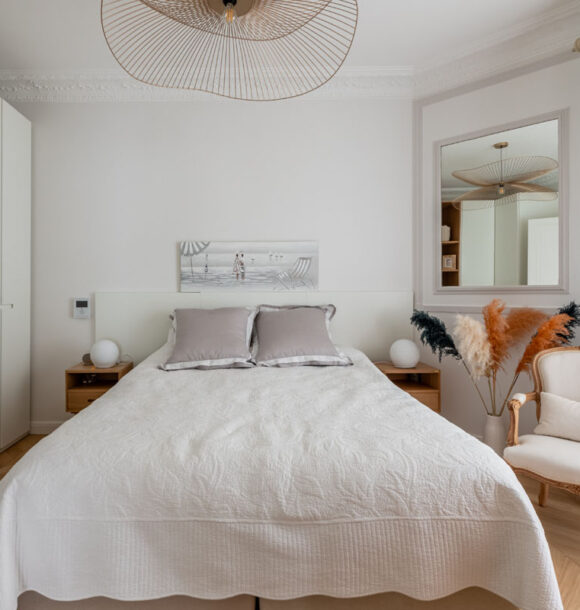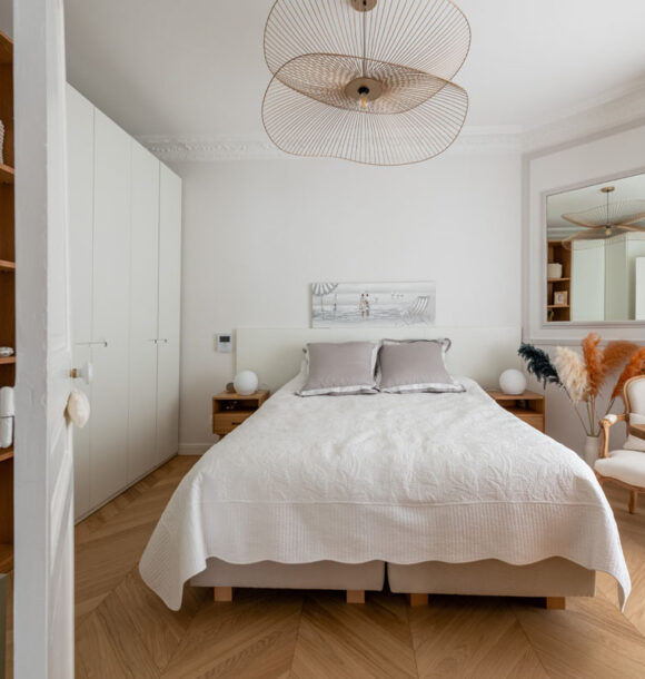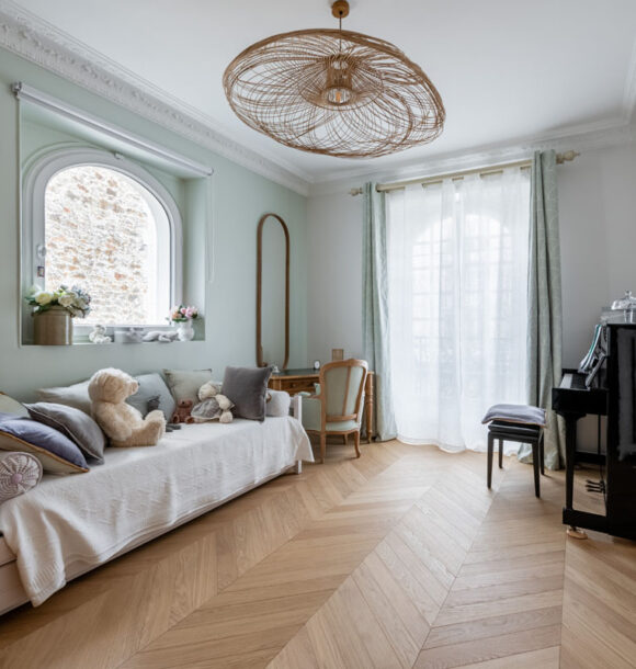 Nous avons donc réalisé notre étude en nous basant sur les goûts de nos clients pour le style scandinave et les jolies matières. D’une tonalité neutre, nous avons apporté de l’élégance avec des rideaux confectionnés sur-mesure par notre couturière et redonner tout son charme à l’appartement en proposant un parquet en point de Hongrie.