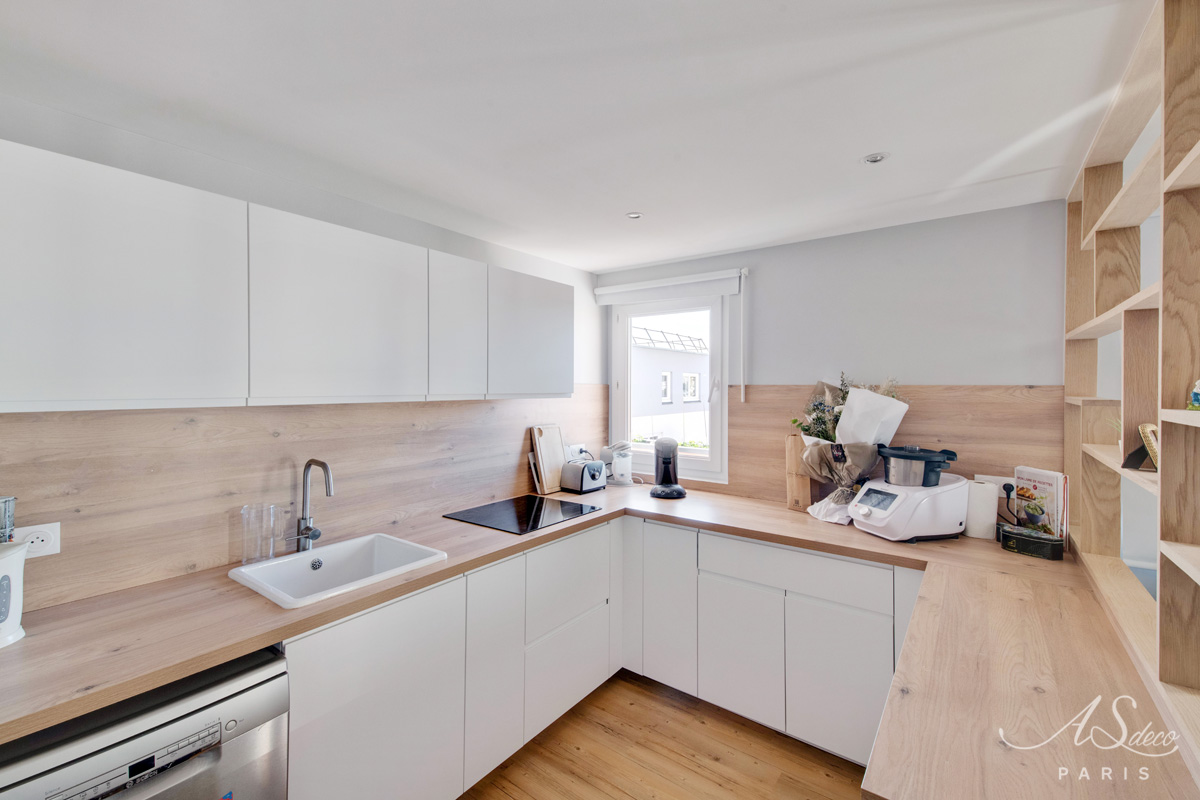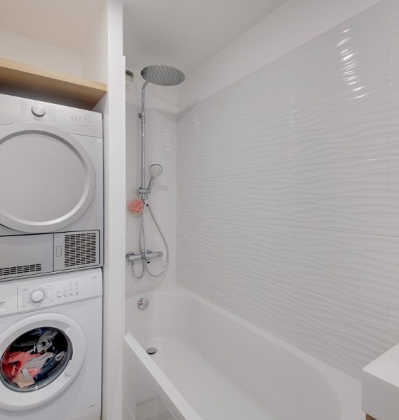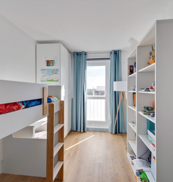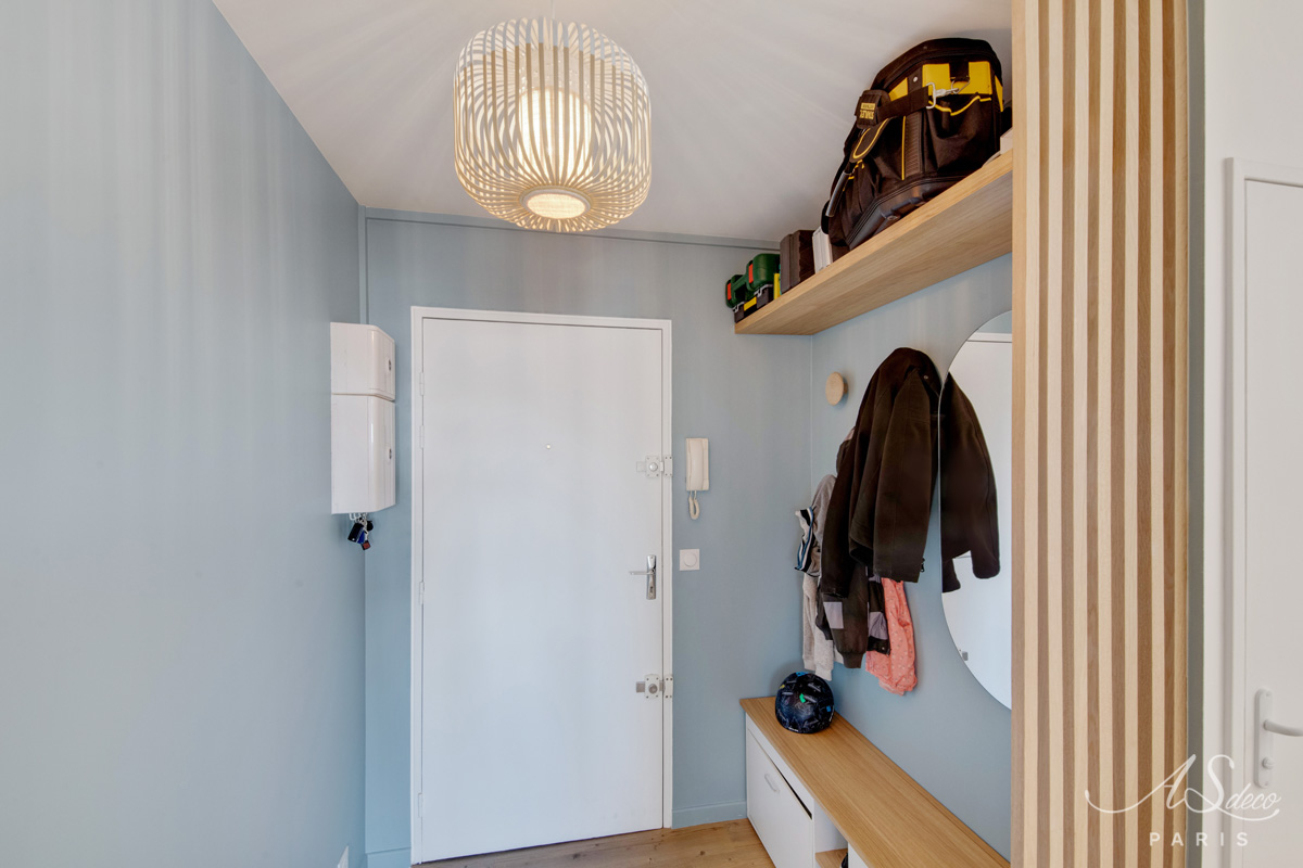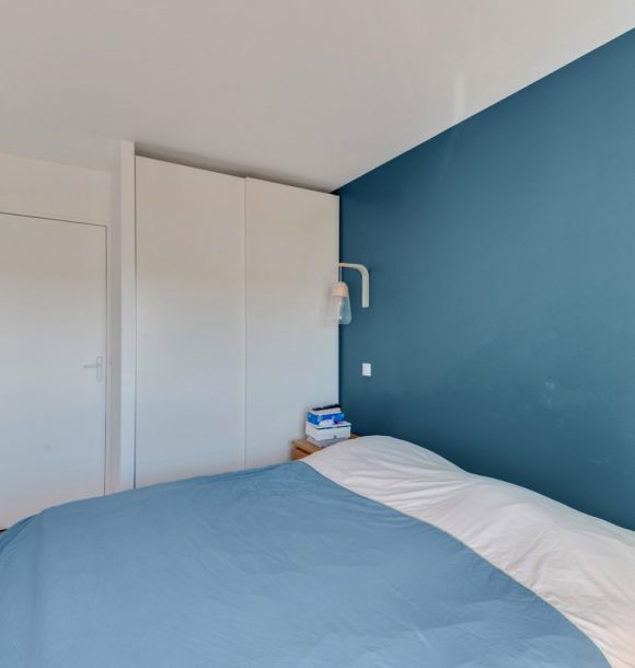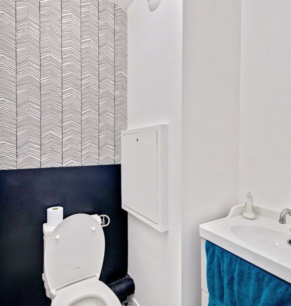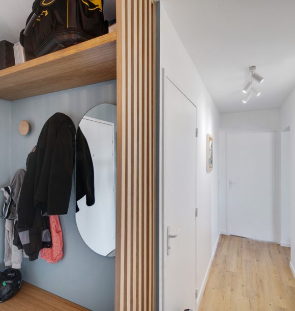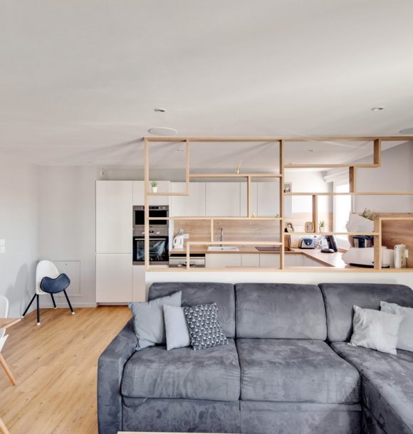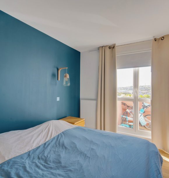 La couleur bleue a été le fil conducteur du projet nous amenant à sélectionner un joli canapé en velours, une cuisine bleu électrique relevée de jolies poignées en laiton. Pour la salle de bains, nous avons imaginé un joli carrelage noir en pose chevron au dos du meuble vasque et un carrelage grand format dans la douche coloris grège pour agrandir l’espace.