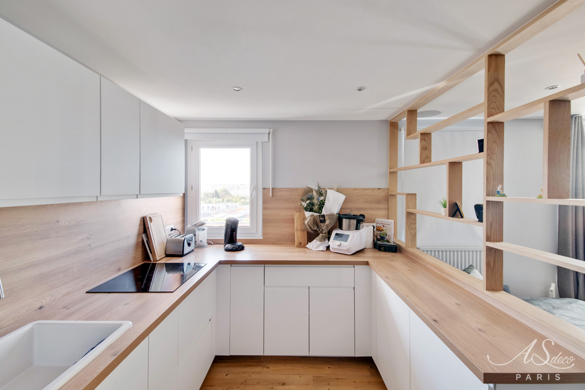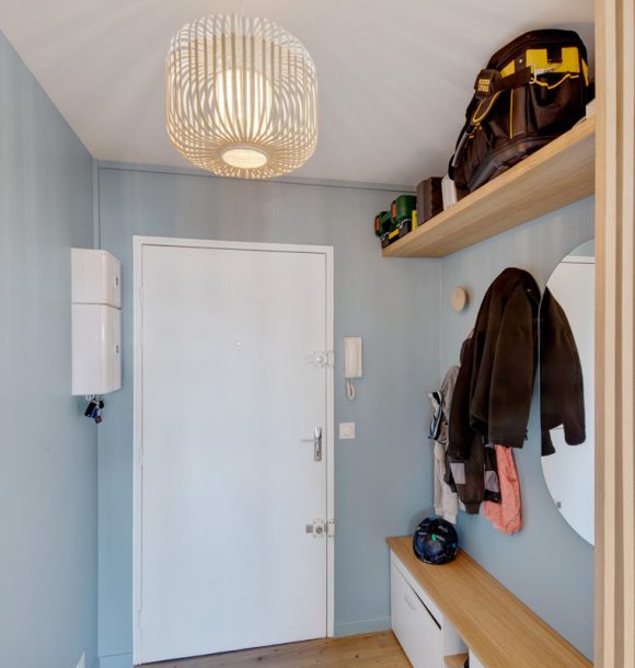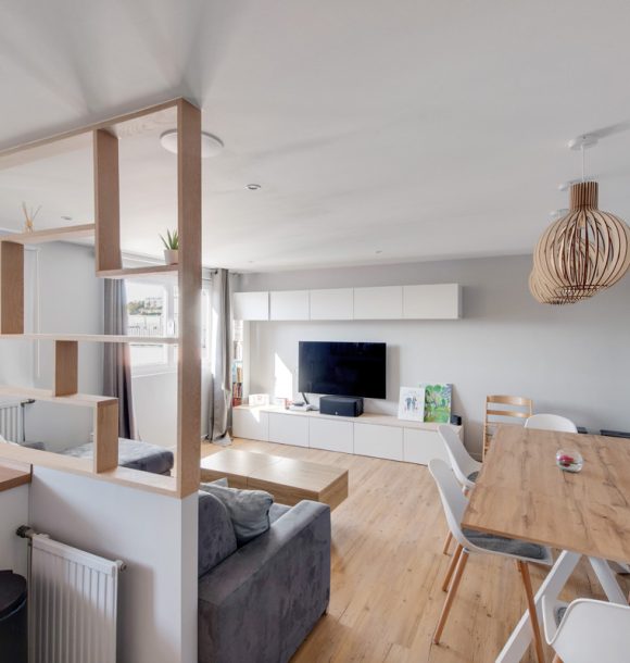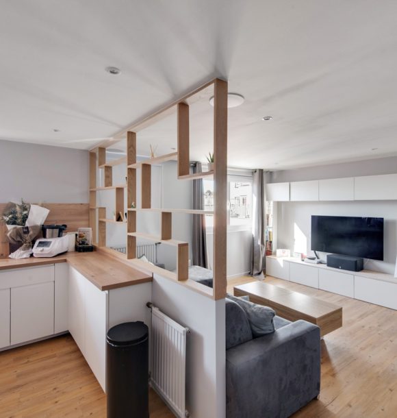 Au départ, il s’agissait d’une dépendance cloisonnée en deux pièces laissée dans son jus que nous avons intégralement repensé en un studio charmant et moderne aux goûts de notre cliente et pouvant plaire au plus grand nombre.
