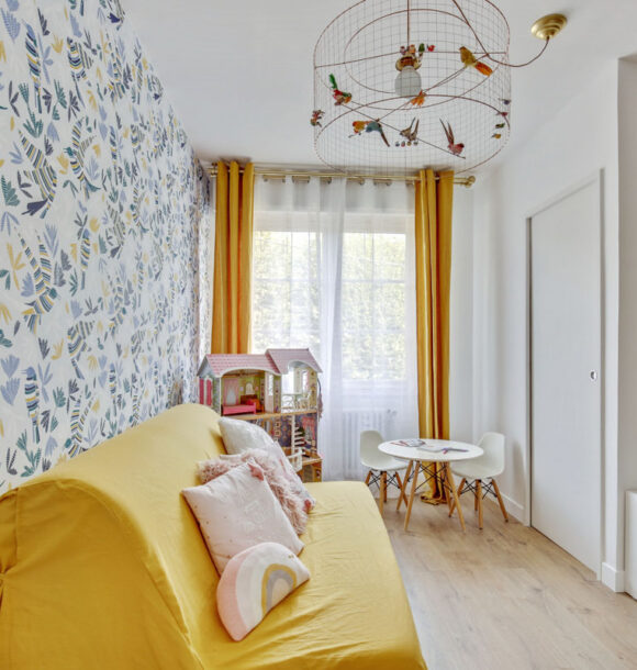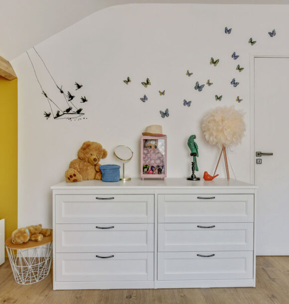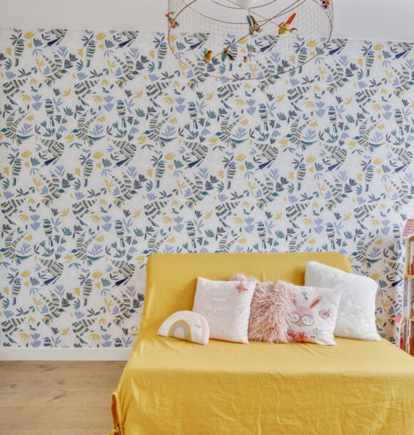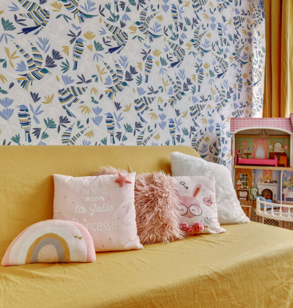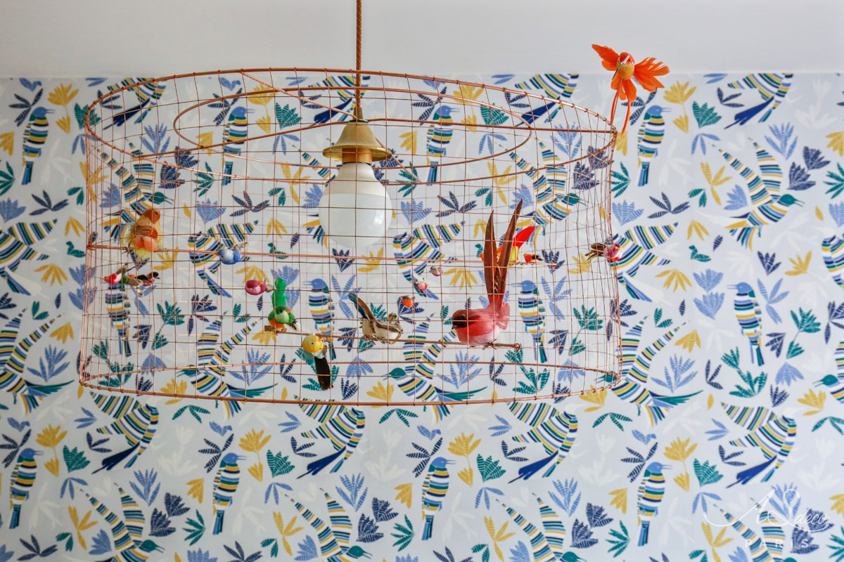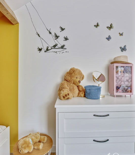 Nous avons choisi de placer le lit sous les combles pour optimiser la circulation et bénéficier ainsi de plus de rangements. La décoration sur la thématique des oiseaux s’est étendue du papier-peint jusqu’à la suspension. Nous avons joué sur le fait que la chambre était sous les toits pour imaginer la décoration en faisant ressortir les poutres qui laissaient planer l’idée d’un nid dans un arbre perché.
