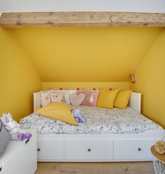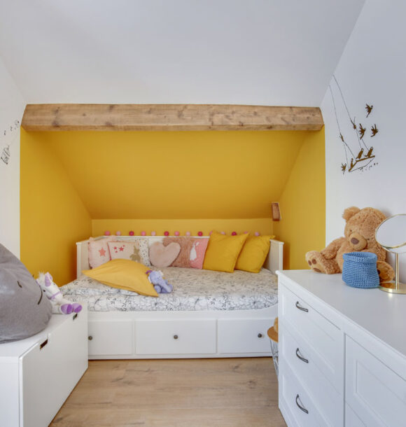 Nous avons commencé par optimiser les espaces en supprimant la cloison qui séparait la chambre des combles. Cela nous a permis de revoir intégralement l’aménagement et l’agencement de la chambre et d’en faire ressortir tout le potentiel.