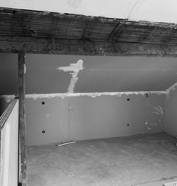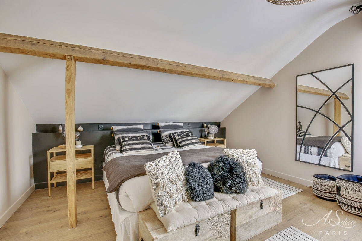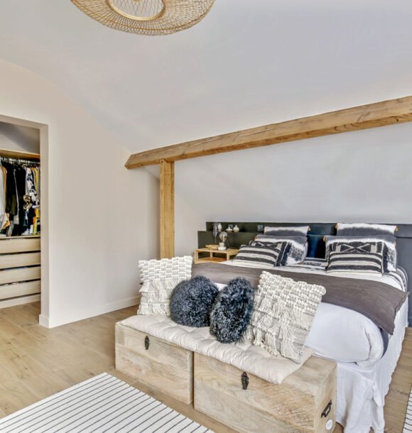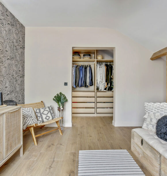 Dans cette chambre, tout était à imaginer. En effet, les combles n’étaient pas exploités et la chambre était trop petite pour y intégrer le lit que possédaient nos clients et un espace dressing digne de ce nom. Nous avons donc récupéré une partie de la salle de bain attenante pour y créer l’espace dressing et avons positionné le lit sous les combles. La chambre est dorénavant plus spacieuse.