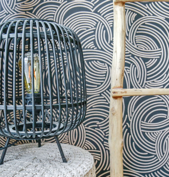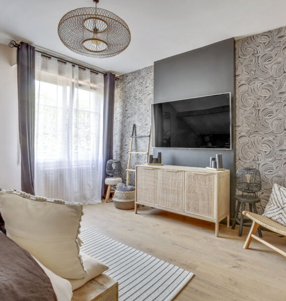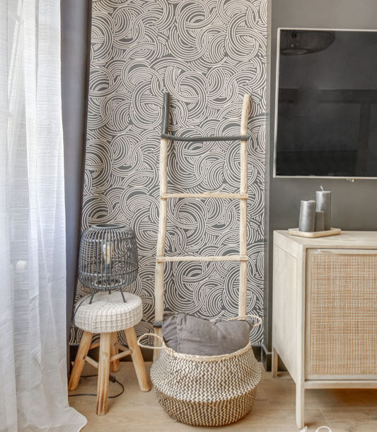 Côté déco, nous avons sélectionné du linge de lit en lin, placé des coussins en macramé et en laine de Mongolie. Pour mettre en valeur le mur face au lit et délimiter le décroché prévu pour la tv murale, nous avons proposé un papier-peint aux formes rondes donnant un caractère exotique à la pièce. Un espace lecture a été créé avec une assise en rotin, une fois de plus pour marquer l’esprit nomade de la décoration. Côté dressing, nous avons positionné des caissons Pax et commodes Malm de chez Ikea afin de respecter le budget annoncé au départ par les clients.